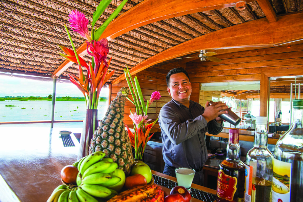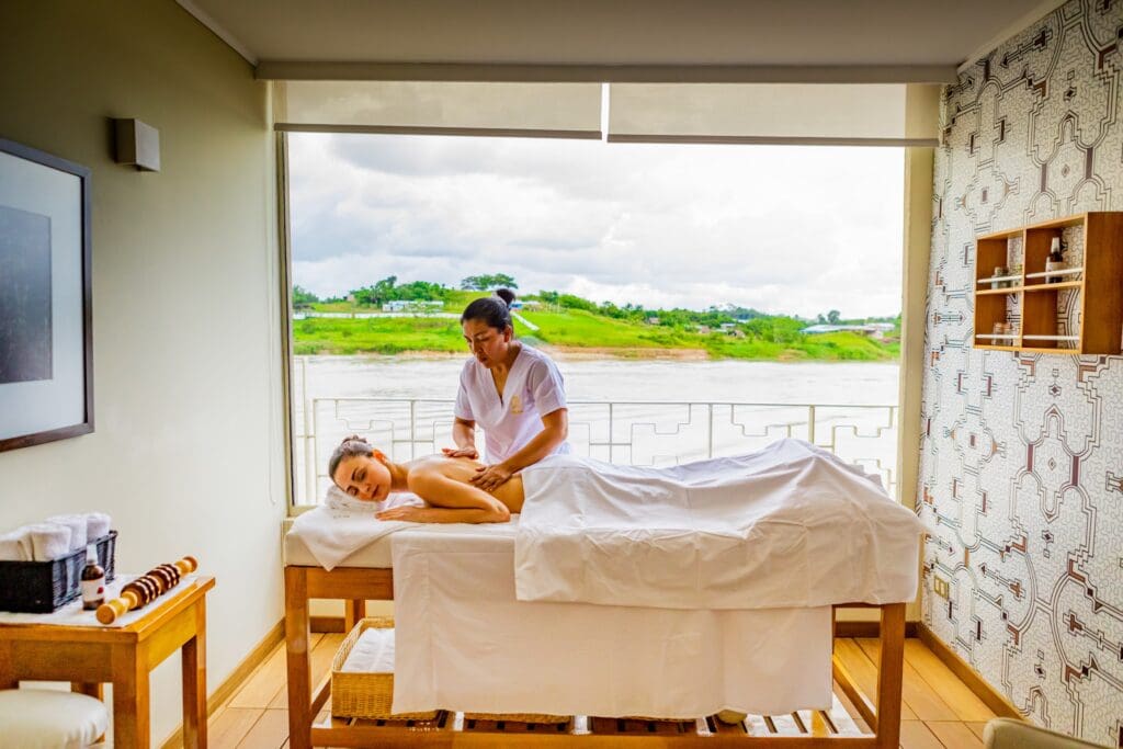 The suite categories vary in scale, but the quality is consistent throughout. Every cabin is equipped with spa-quality bath amenities, luxury cotton linens, premium mattresses, and individual climate control. The Andes Suite at the bow, at 597 square feet with 180-degree wraparound windows and a clawfoot bathtub, is the kind of room that makes retreating to your stateroom genuinely appealing rather than simply tolerable. On a journey this immersive, and with the Amazonian climate, that matters. You want to be able to step back from the environment, absorb what you’ve seen, and return to the river the next day refreshed.