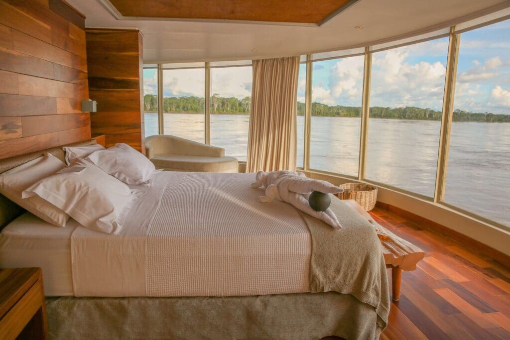 The Delphin III was locally built, carries a crew of 30, and was inducted into the Relais & Châteaux group in recognition of its commitment to local nature, culture, and its Amazonian-Peruvian cuisine. That the ship earned this recognition independently, before being sought out by operators of Lindblad’s caliber, says something about where it sits in the market. Relais & Châteaux is a standard that requires specificity of place, quality of cuisine, and genuine integration with the surrounding environment. The ship’s interiors feature hand-made furniture, art, and textiles sourced from surrounding communities, not as decorative concepts but as genuine support of the regional supply chain. The 22 suites are wrapped in floor-to-ceiling, wall-to-wall windows, which on a rainforest river means the jungle is always present, whether you’re lying in bed at dawn or sitting down to dinner in the evening.