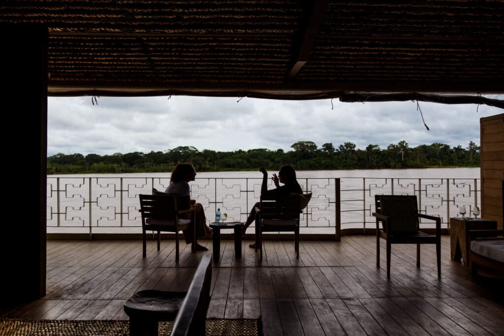 By late afternoon the ship is back at anchor, and the pace slows. The observation deck with its open-air whirlpool offers a different vantage on the river, and the lounge fills for the evening naturalist presentation, which tends to function as a way of making sense of the day’s encounters, giving them context and connecting individual observations to the larger biology of the region. Then dinner, which aboard the Delphin III is a truly considered meal. The kitchen works with Amazonian-Peruvian ingredients, and the result is cooking that is specific to where you are rather than generic or catered to an international clientele. A glass of wine while looking out onto the river at dusk, with no other light visible in any direction is something that’s increasingly rare in well-traveled circles: genuine solitude in a genuinely remarkable place.